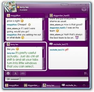 First, start a few IM conversations and then drag the bottom tab of one window into another (or can be done by pressing Ctrl + comma ) to condense them into one window as tabs. Now to get the Matrix mode just press Ctrl + Alt + Shift + b which will turn your tabbed conversation window into one single window with a matrix of boxes, each showing an IM conversation.